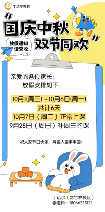 月满人间时,家国共欢日。愿这个假期,有月饼的香甜、亲情的温暖,更有成长的喜悦。感谢您的理解与配合,祝您和家人双节安康,万事顺遂!