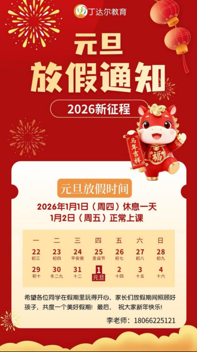 律回春晖渐,万象始更新。元旦的钟声即将敲响,我们与您一同期待新的一年。愿孩子们在知识的海洋中快乐探索,在成长的路上勇敢前行。祝福您和家人元旦快乐,平安喜乐,新岁常欢愉,年年皆胜意!